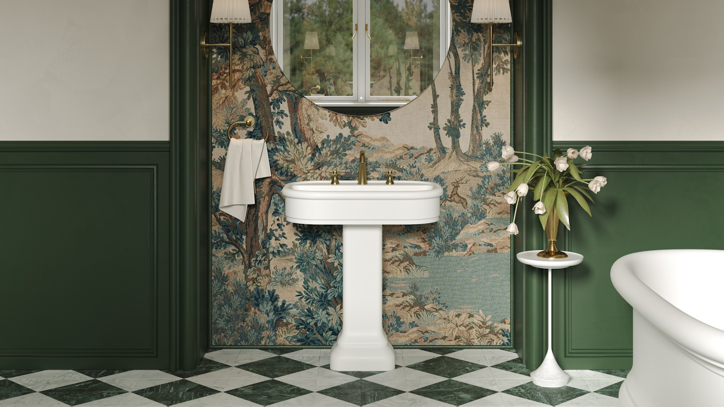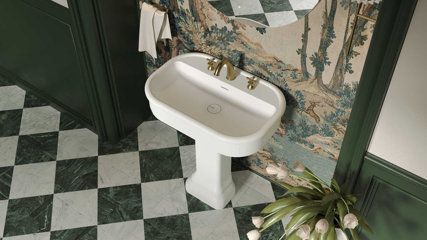 Принадлежность к премиальному сегменту сантехники подчёркнута выразительными скруглениями декоративных элементов и акцентированными архитектурными деталями, характерными для престижной европейской классики.