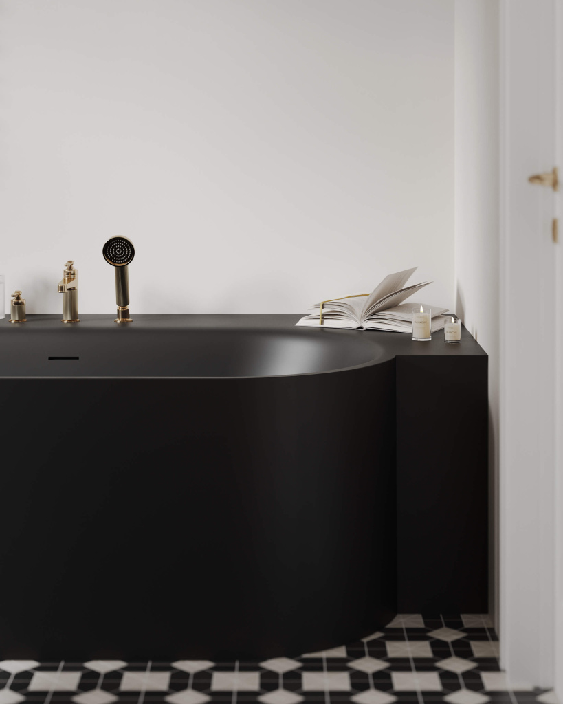 Центральная фигура композиции — отдельностоящая ванна PERLA, выполненная в глубоком чёрном цвете. Смелый выбор оттенка придает изделию особенную привлекательность. Угловая плоскость ванны предлагает дополнительное пространство, где можно разместить мягкое полотенце или гель для душа с любимым ароматом, чтобы они всегда были под рукой. Идеальная гладкая матовая поверхность модели вызывает непреодолимое желание прикоснуться к ней, наслаждаясь каждым моментом контакта. Созданная из надолго сохраняющего в себе тепло воды литьевого мрамора, ванна PERLA нежно поддержит ваше тело в своих надежных объятиях.