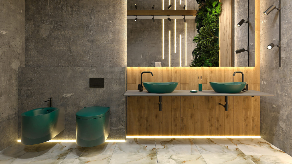В основе дизайнерского проекта — идея тонкого диалога с природой, где цвет, форма и фактура работают как единое целое. Дизайн ванной комнаты построен на ощущении визуального равновесия и спокойствия: изящные линии ванны и раковины, продуманная геометрия пространства и благородные акцентные оттенки формируют цельный, гармоничный образ.