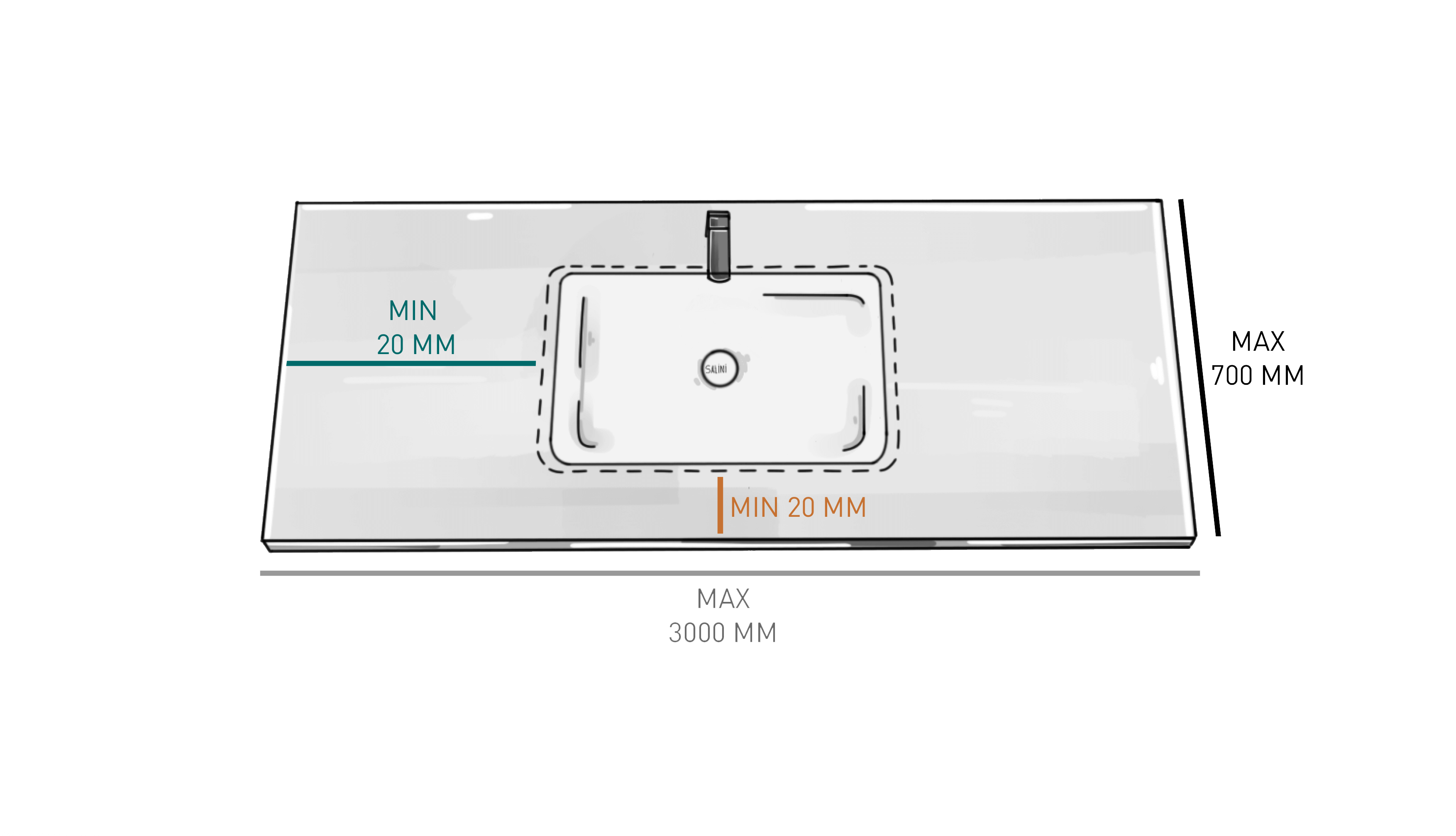 - наращивание длины столешницы до 3 000 мм (с возможностью размещения до 3-х чаш одновременно);