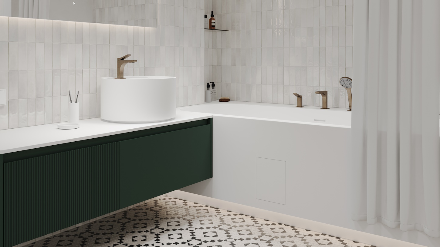 Подсветка визуально приподнимает ванну над полом, создавая эффект "парения" в воздухе и смягчая её массивность. Ванна становится интересным дизайнерским объектом проекта и делает ванную комнату лёгкой и воздушной.