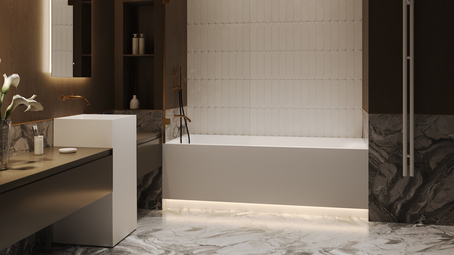 Ниша для ног в экранах встраиваемых ванн Salini спроектирована с учётом естественного положения стоп, что обеспечивает более удобный подход к ванне. Дополнительная возможность — подсветка — делает решение не только функциональным, но и эстетичным.